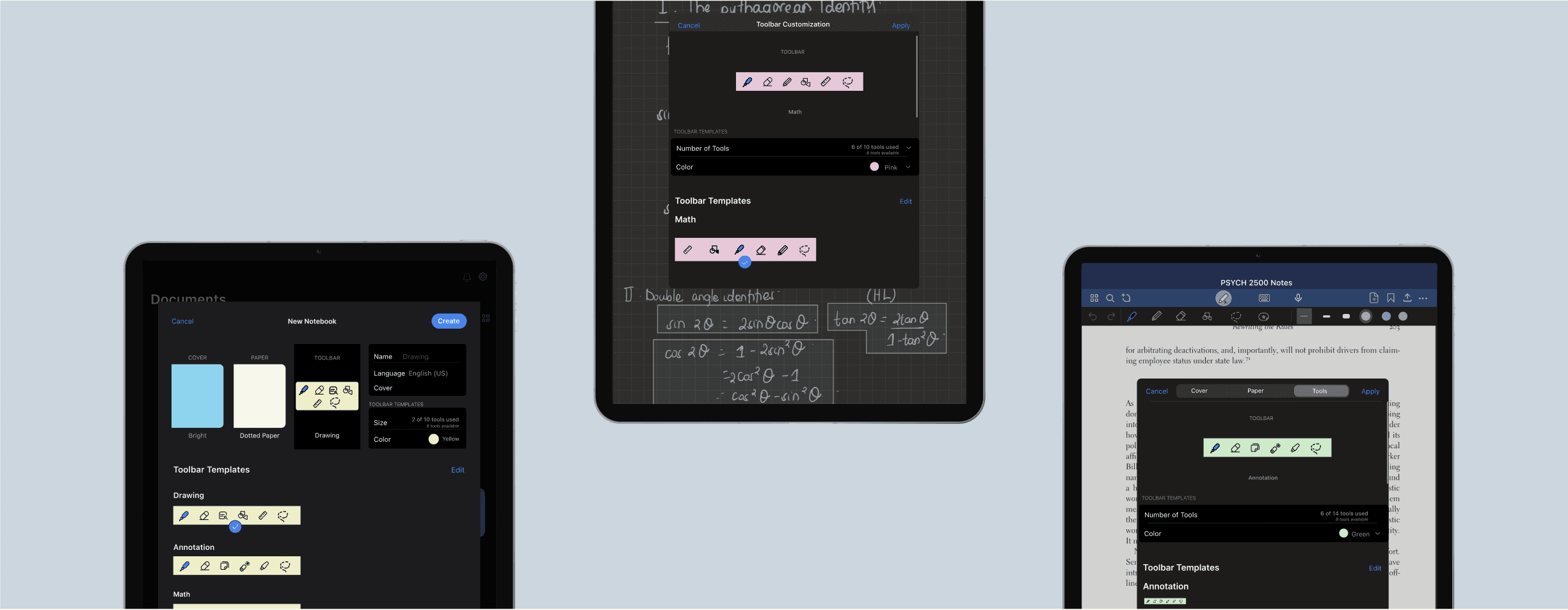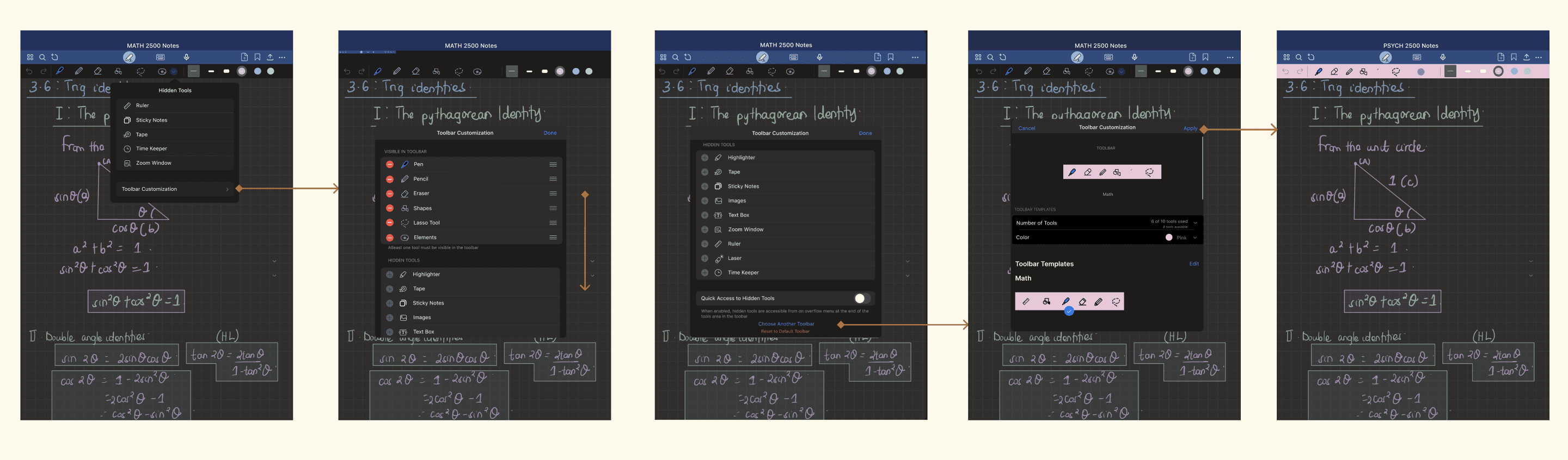 My solution is to add premade toolbars for different use cases, so users can quickly grab the tools they need and make Goodnotes feel more customized.