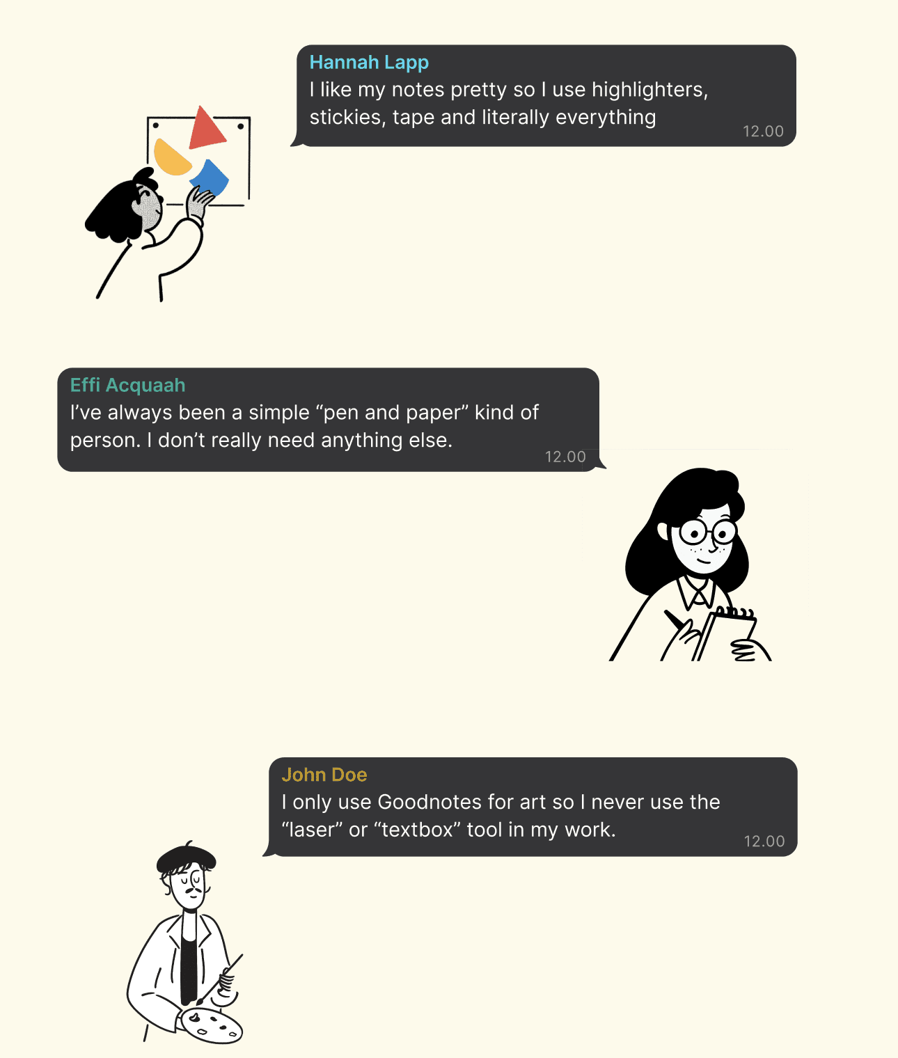 Even though I use Goodnotes, I really had to step out of “Justina” and step into the shoes of a ‘College Student that uses Goodnotes to take notes”. This helps with fulfilling the previous point that I made, that I am able to make less assumptions if It is not me I’m designing for.